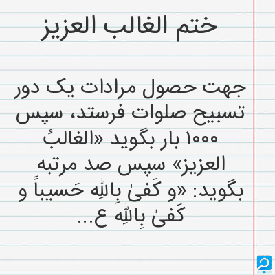 جهت حصول مرادات یک دور تسبیح صلوات فرستد، سپس ۱۰۰۰ بار بگوید «الغالبُ العزیز» سپس صد مرتبه بگوید: «و کَفیٰ بِاللهِ حَسیباً و کَفیٰ بِاللهِ علیماً و کَفیٰ بِاللهِ وِلیّاً و کَفیٰ بِاللهِ شهیداً محمدٌ رسولُ الله».