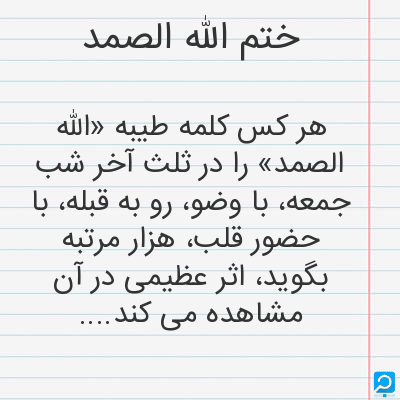 هر کس کلمه طیبه «الله الصمد» را در ثلث آخر شب جمعه، با وضو، رو به قبله، با حضور قلب، هزار مرتبه بگوید، اثر عظیمی در آن مشاهده می کند.