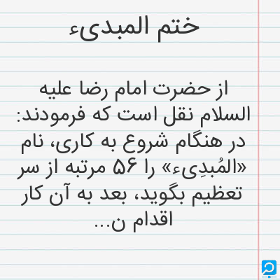 از حضرت امام رضا علیه السلام نقل است که فرمودند: در هنگام شروع به کاری، نام «المُبدِیء» را 56 مرتبه از سر تعظیم بگوید، بعد به آن کار اقدام نماید، البته آن کار به سرانجام رسد.