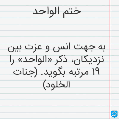 به جهت انس و عزت بین نزدیکان، ذکر «الواحد» را 19 مرتبه بگوید. (جنات الخلود)