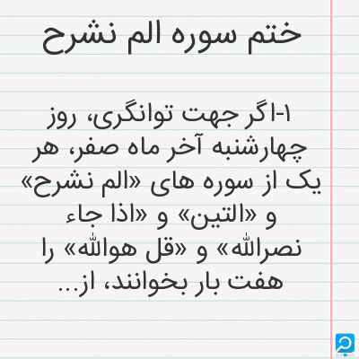 ۱-اگر جهت توانگری، روز چهارشنبه آخر ماه صفر، هر یک از سوره های «الم نشرح» و «التین» و «اذا جاء نصرالله» و «قل هوالله» را هفت بار بخوانند، از مال دنیا غنی و بی نیاز گردند.