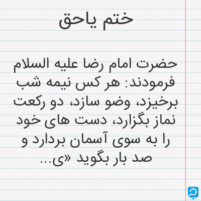 حضرت امام رضا علیه السلام فرمودند: هر کس نیمه شب برخیزد، وضو سازد، دو رکعت نماز بگزارد، دست های خود را به سوی آسمان بردارد و صد بار بگوید «یا حقّ» و بر این ذکر مداومت نماید، دل او نورانی گردد و به صفای باطن و جلای قلب به جایی رسد که ضمیرالناس بر وی منکشف گردد.