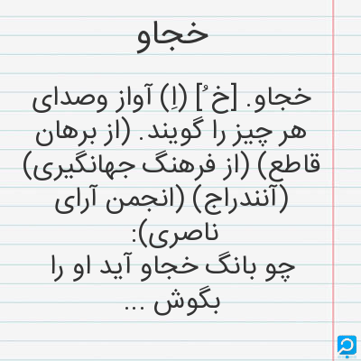 خجاو. [خ ُ] (اِ) آواز وصدای هر چیز را گویند. (از برهان قاطع) (از فرهنگ جهانگیری) (آنندراج) (انجمن آرای ناصری):