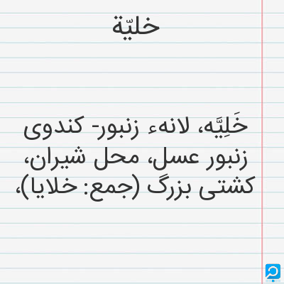 خَلِیَّه، لانهء زنبور- کندوی زنبور عسل، محل شیران، کشتی بزرگ (جمع: خلایا)،