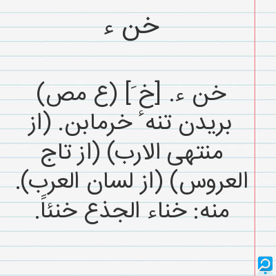 خن ء. [خ َ] (ع مص) بریدن تنه ٔ خرمابن. (از منتهی الارب) (از تاج العروس) (از لسان العرب). منه: خناء الجذع خنئاً.