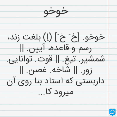 خوخو. [خ َ خ َ] (اِ) بلغت زند، رسم و قاعده، آیین. || شمشیر. تیغ. || قوت. توانایی. زور. || شاخه. غصن. || داربستی که استاد بنا روی آن میرود کار می کند. (ناظم الاطباء). رجوع به خو شود.