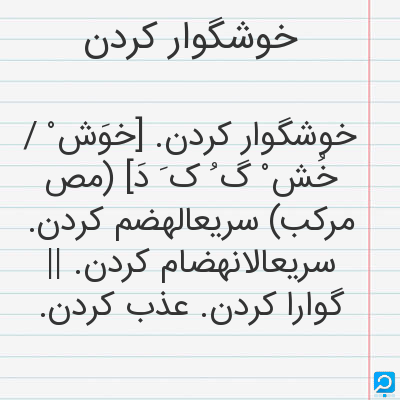 خوشگوار کردن. [خوَش ْ / خُش ْ گ ُ ک َ دَ] (مص مرکب) سریعالهضم کردن. سریعالانهضام کردن. || گوارا کردن. عذب کردن.