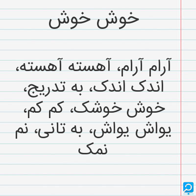 خوش خوش. [خوَش ْ / خُش ْ خوَش ْ / خُش ْ] (ق مرکب) آهسته آهسته. رفته رفته. کم کم. نرم نرم. (یادداشت مؤلف). خوش خوشک: