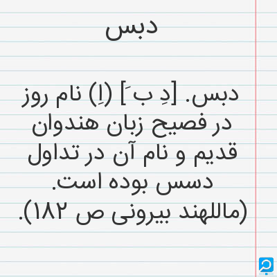 دبس. [دِ ب َ] (اِ) نام روز در فصیح زبان هندوان قدیم و نام آن در تداول دسس بوده است. (ماللهند بیرونی ص 182).