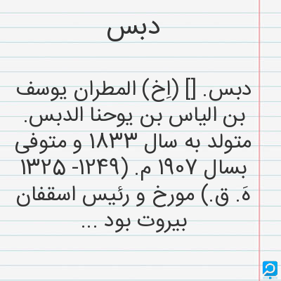 دبس. [] (اِخ) المطران یوسف بن الیاس بن یوحنا الدبس. متولد به سال 1833 و متوفی بسال 1907 م. (1249- 1325 هَ. ق.) مورخ و رئیس اسقفان بیروت بود و بنیان گذار کنیسه ٔ بزرگی در سوریه و صاحب تصانیف و تألیفات بسیار که از آن جمله است: تاریخ سوریه از آغاز آفرینش تا زمان مؤلف. جامعالمفصل فی الموازنه المؤصل. الحجه القاطعه الجلیه علی من ینکر ثبوت الموازنه فی العقیده ٔ الکاثولیکیه. الرسوم الفلسفیه. روح الردود. سفرالاخیار فی سفر الاحبار. شرح فی تقسیم الارث. مربی الصغار و مرقی الکبار - مغنی المتعلم عن المعلم - الموجز فی تاریخ سوریه. (معجم المطبوعات). و نیز رجوع به یوسف بن الیاس در الاعلام زرکلی شود.