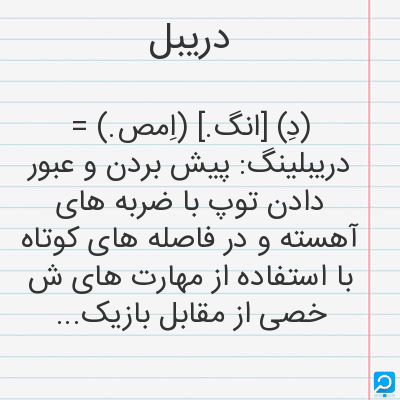 (دِ) [انگ.] (اِمص.) = دریبلینگ: پیش بردن و عبور دادن توپ با ضربه های آهسته و در فاصله های کوتاه با استفاده از مهارت های ش خصی از مقابل بازیکن تیم مقابل.