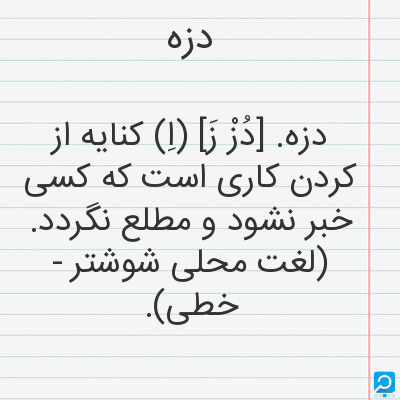 دزه. [دُزْ زَ] (اِ) کنایه از کردن کاری است که کسی خبر نشود و مطلع نگردد. (لغت محلی شوشتر - خطی).
