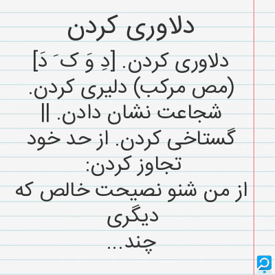 دلاوری کردن. [دِ وَ ک َ دَ] (مص مرکب) دلیری کردن. شجاعت نشان دادن. || گستاخی کردن. از حد خود تجاوز کردن: