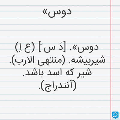 دوس». [دَ س َ] (ع اِ) شیربیشه. (منتهی الارب). شیر که اسد باشد. (آنندراج).