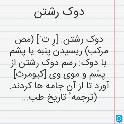 دوک رشتن. [رِ ت َ] (مص مرکب) ریسیدن پنبه یا پشم با دوک: رسم دوک رشتن از پشم و موی وی [کیومرث] آورد تا از آن جامه ها کردند. (ترجمه ٔ تاریخ طبری بلعمی).