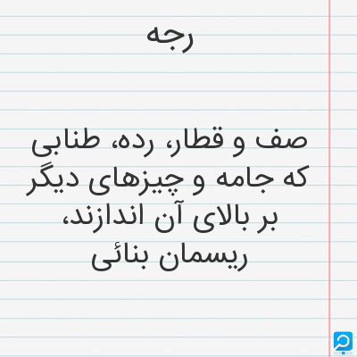 رجه. [رَ ج َ / ج ِ] (اِ) صف. قطار. رده. (ناظم الاطباء). || طنابی که جامه و لنگی و چیزهای دیگر بر بالای آن اندازند. (فرهنگ فارسی معین) (آنندراج) (برهان) (ناظم الاطباء). رَزه. رَژه. ریجه. ریسمانی که دو سر آن را به دو دیوار یا دو درخت بندند و رخت بر آن آویزند. || ریسمانی که در بنایی بکار رود. (فرهنگ فارسی معین).