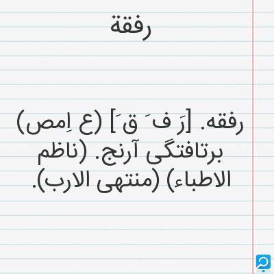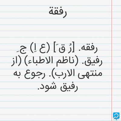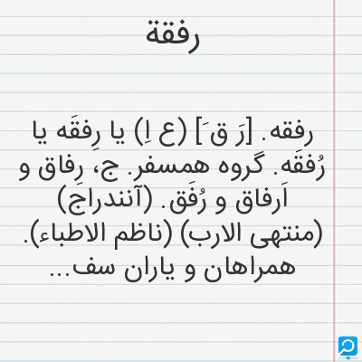 رفقه. [رَ ق َ] (ع اِ) یا رِفقَه یا رُفقَه. گروه همسفر. ج، رِفاق و اَرفاق و رُفَق. (آنندراج) (منتهی الارب) (ناظم الاطباء). همراهان و یاران سفر. (دهار). گروه همراه و همدم و هم صحبت. (ناظم الاطباء).