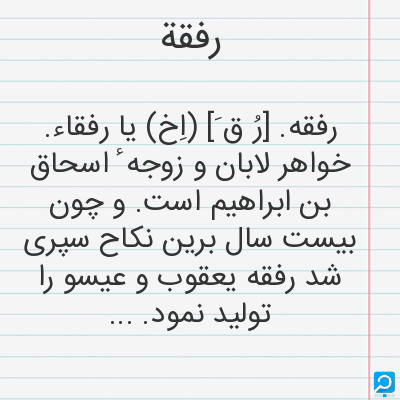 رفقه. [رُ ق َ] (اِخ) یا رفقاء. خواهر لابان و زوجه ٔ اسحاق بن ابراهیم است. و چون بیست سال برین نکاح سپری شد رفقه یعقوب و عیسو را تولید نمود. (از قاموس کتاب مقدس). رجوع به رفقاء شود.