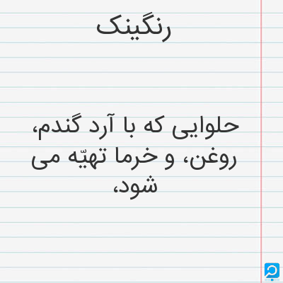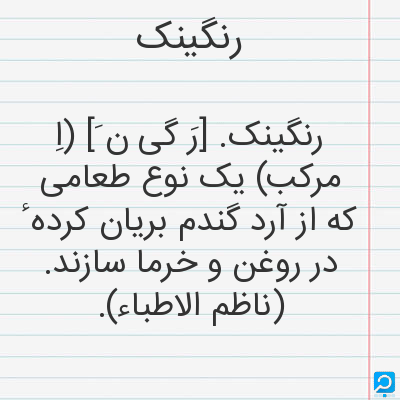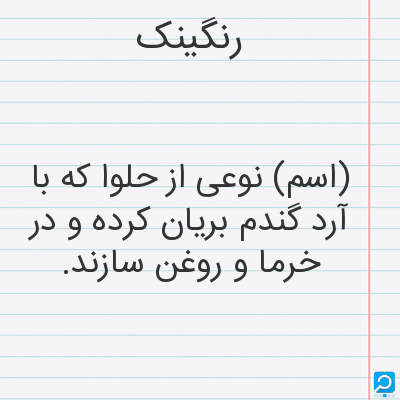 رنگینک. [رَ گی ن َ] (اِ مرکب) یک نوع طعامی که از آرد گندم بریان کرده ٔ در روغن و خرما سازند. (ناظم الاطباء).