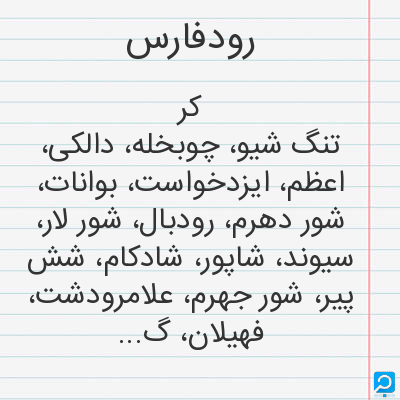 تنگ شیو، چوبخله، دالکی، اعظم، ایزدخواست، بوانات، شور دهرم، رودبال، شور لار، سیوند، شاپور، شادکام، شش پیر، شور جهرم، علامرودشت، فهیلان، گلهدار، مند، مهران شور