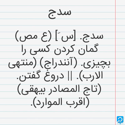 سدج. [س َ] (ع مص) گمان کردن کسی را بچیزی. (آنندراج) (منتهی الارب). || دروغ گفتن. (تاج المصادر بیهقی) (اقرب الموارد).