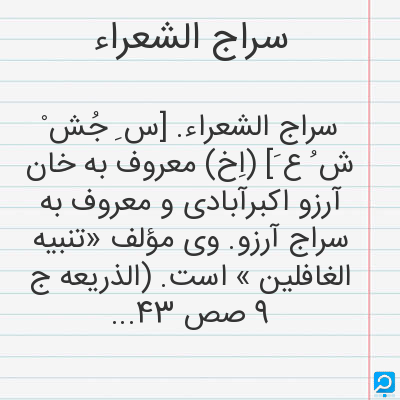 سراج الشعراء. [س ِ جُش ْ ش ُ ع َ] (اِخ) معروف به خان آرزو اکبرآبادی و معروف به سراج آرزو. وی مؤلف «تنبیه الغافلین » است. (الذریعه ج 9 صص 436- 437).