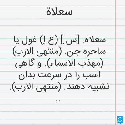 سعلاه. [س ِ] (ع اِ) غول یا ساحره جن. (منتهی الارب) (مهذب الاسماء). و گاهی اسب را در سرعت بدان تشبیه دهند. (منتهی الارب).