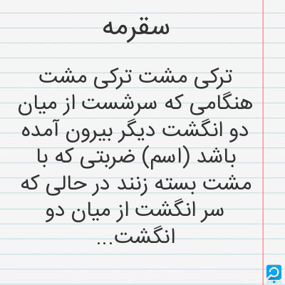 ترکی مشت ترکی مشت هنگامی که سرشست از میان دو انگشت دیگر بیرون آمده باشد (اسم) ضربتی که با مشت بسته زنند در حالی که سر انگشت از میان دو انگشت سبابه و وسطی بیرون آمده باشد.