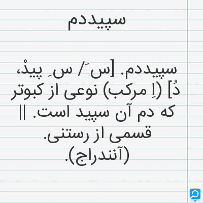 سپیددم. [س َ/ س ِ پیدْ، دُ] (اِ مرکب) نوعی از کبوتر که دم آن سپید است. || قسمی از رستنی. (آنندراج).