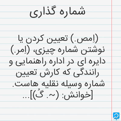 (اِمص.) تعیین کردن یا نوشتن شماره چیزی، (اِمر.) دایره ای در اداره راهنمایی و رانندگی که کارش تعیین شماره وسیله نقلیه هاست. [خوانش: (~. گُ)]