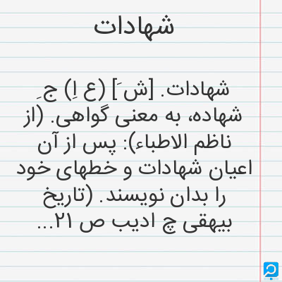 شهادات. [ش َ] (ع اِ) ج ِ شهاده، به معنی گواهی. (از ناظم الاطباء): پس از آن اعیان شهادات و خطهای خود را بدان نویسند. (تاریخ بیهقی چ ادیب ص 212). و رجوع به شهاده و شهادت شود.