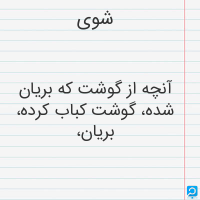 شوی. [ش َ وی ی] (ع ص) بریانی و یقال فی الاتباع: عَوی ّ شَوی ّ و کذا عَیی ّ شَیی ّ، مأخوذ من الشواء و هو الرذال. (منتهی الارب). شَویّه. گوشت بریانی شده. (از اقرب الموارد). بریان: