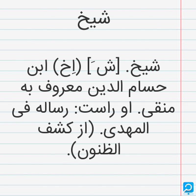 شیخ. [ش َ] (اِخ) ابن حسام الدین معروف به منقی. او راست: رساله فی المهدی. (از کشف الظنون).