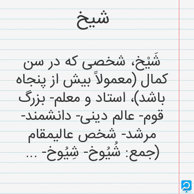 شَیْخ، شخصی که در سن کمال (معمولاً بیش از پنجاه باشد)، استاد و معلم- بزرگ قوم- عالم دینی- دانشمند- مرشد- شخص عالیمقام (جمع: شُیُوخ- شِیُوخ- اَشْیاخ- شِیْخَه- مَشِیْخَه- شَْیَخَه جمع الجمع: مَشایِخ- اَشیاخ)،