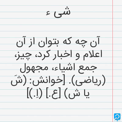 آن چه که بتوان از آن اعلام و اخبار کرد، چیز، جمع اشیاء، مجهول (ریاضی). [خوانش: (شَ یا ش) [ع.] (اِ.)]