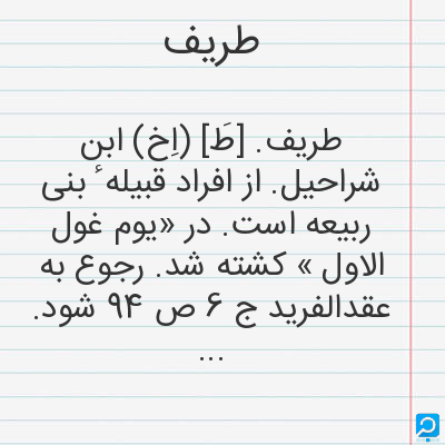طریف. [طَ] (اِخ) ابن شراحیل. از افراد قبیله ٔ بنی ربیعه است. در «یوم غول الاول » کشته شد. رجوع به عقدالفرید ج 6 ص 94 شود.
