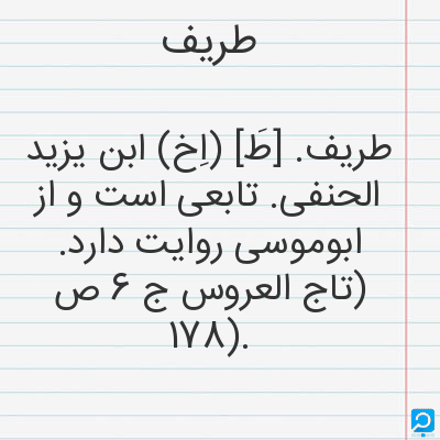 طریف. [طَ] (اِخ) ابن یزید الحنفی. تابعی است و از ابوموسی روایت دارد. (تاج العروس ج 6 ص 178).