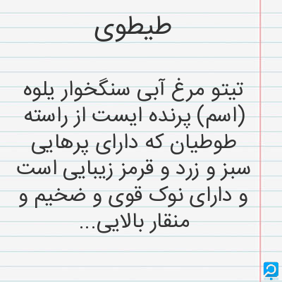 تیتو مرغ آبی سنگخوار یلوه (اسم) پرنده ایست از راسته طوطیان که دارای پرهایی سبز و زرد و قرمز زیبایی است و دارای نوک قوی و ضخیم و منقار بالایی بسیار خمیده و قرمز رنگ دو انگشت در جلو و دو انگشت در عقب دارد. طوطی از پرندگان نواحی استوایی است و در افریقای غربی و هندوستان و هندو چین فراوان است و به سبب زبان عضلانی که دارد می تواند به آسانی اصوات را تقلید کند. در آمریکای جنوبی نیز گونه های مختلف طوطی فراوانند. یا طوطی زرین نفس. قلم. یا طوطی صاحب سلامت گو. طوطی که او را تعلیم داده باشند که چون صاحب خود یا بزرگی را بیند بگوید صاحب سلامت: در میان نو خطان باقی همه نیرنگ تست طوطی صاحب سلامت گو خط شبرنگ تست. (ملا قاسم مهدی) یا طوطی صحرا. سبزه. (اسم) نوعی مرغابی، نوعی مرغ سنگخوار قسمی از قطا که بلند پاست.
