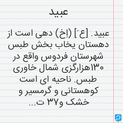 عبید. [ع َ] (اِخ) دهی است از دهستان یخاب بخش طبس شهرستان فردوس واقع در 130هزارگزی شمال خاوری طبس. ناحیه ای است کوهستانی و گرمسیر و خشک و37 تن سکنه دارد آب آن از قنات تأمین میشود و محصولات آن غلات و ذرت است. اهالی به کشاورزی اشتغال دارندراه مالرو دارد. (از فرهنگ جغرافیائی ایران ج 9).