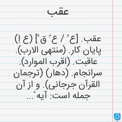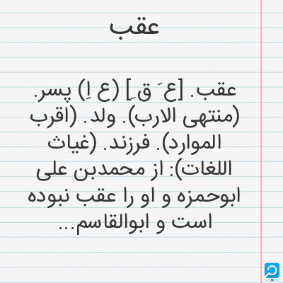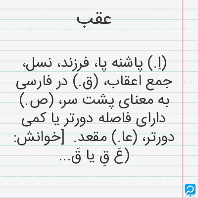 (اِ.) پاشنه پا، فرزند، نسل، جمع اعقاب، (ق.) در فارسی به معنای پشت سر، (ص.) دارای فاصله دورتر یا کمی دورتر، (عا.) مقعد. [خوانش: (عَ قِ یا قَ) [ع.]]