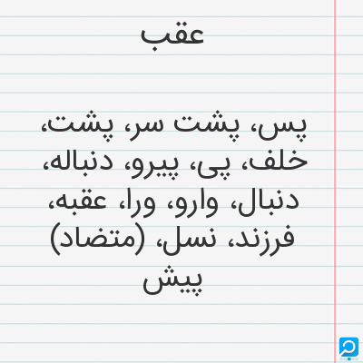 پس، پشتسر، پشت، خلف، پی، پیرو، دنباله، دنبال، وارو، ورا، عقبه، فرزند، نسل،
