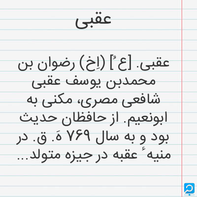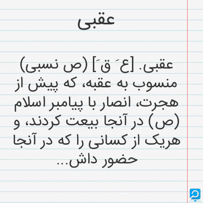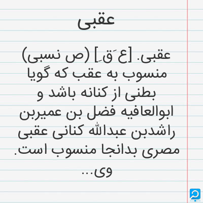 عقبی. [ع َق ِ] (ص نسبی) منسوب به عقب که گویا بطنی از کنانه باشد و ابوالعافیه فضل بن عمیربن راشدبن عبداﷲ کنانی عقبی مصری بدانجا منسوب است. وی محدث بود و به سال 197 هَ. ق. درگذشت. (از اللباب فی تهذیب الانساب).