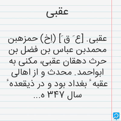 عقبی. [ع َ ق َ] (اِخ) حمزهبن محمدبن عباس بن فضل بن حرث دهقان عقبی، مکنی به ابواحمد. محدث و از اهالی عقبه ٔ بغداد بود و در ذیقعده ٔ سال 347 هَ. ق. درگذشت. (از اللباب فی تهذیب الانساب) (از معجم البلدان).