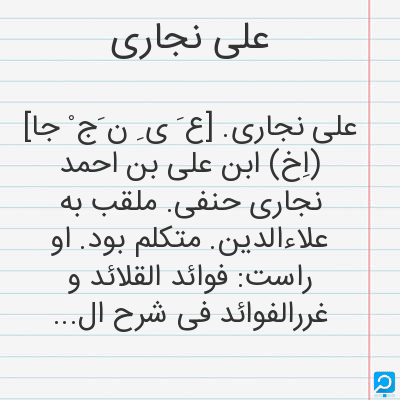 علی نجاری. [ع َ ی ِ ن َج ْ جا] (اِخ) ابن علی بن احمد نجاری حنفی. ملقب به علاءالدین. متکلم بود. او راست: فوائد القلائد و غررالفوائد فی شرح العقائد از نسفی، که در سال 967 هَ. ق. از تألیف آن فراغت یافت. (از هدیه العارفین بغدادی ج 1 ص 746).