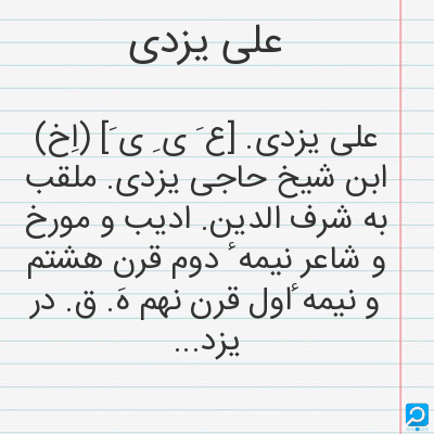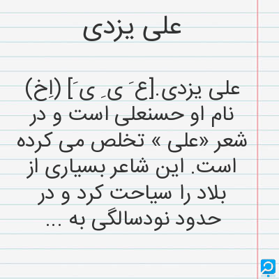 علی یزدی.[ع َ ی ِ ی َ] (اِخ) نام او حسنعلی است و در شعر «علی » تخلص می کرده است. این شاعر بسیاری از بلاد را سیاحت کرد و در حدود نودسالگی به یزد فرودآمد و پس از حدود ده سال در آنجا درگذشت. از اشعار او در حدود هزارو پانصد بیت باقی مانده است که غالب آنها در مدح استاد خود «مؤمن » میباشد. (از الذریعه ٔ ج 9 ص 765).