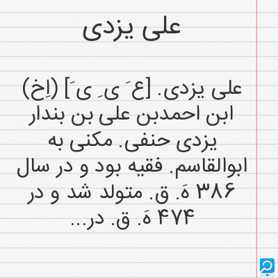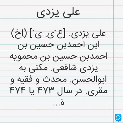 علی یزدی. [ع َی ِ ی َ] (اِخ) ابن احمدبن حسین بن احمدبن حسین بن محمویه یزدی شافعی. مکنی به ابوالحسن. محدث و فقیه و مقری. در سال 473 یا 474 هَ. ق. در یزد متولد شد و دراصفهان و کوفه و مکه تحصیل کرد، و ساکن بغداد گشت ودر سال 551 هَ. ق. درگذشت. او را کتابهای بسیاری در فقه و حدیث است. (از معجم المؤلفین از سیرالنبلاء ج 12 ص 221 و طبقات الشافعیه ٔ اسنوی ص 186 و طبقات القراء ج 1 ص 517 و طبقات الشافعیه ٔ سبکی ج 4 ص 271 و شذرات الذهب ج 4 ص 159 و مرآهالجنان ج 3 ص 298). در منتهی الارب آمده است که «علی بن احمد یزدی » از محدثان است.