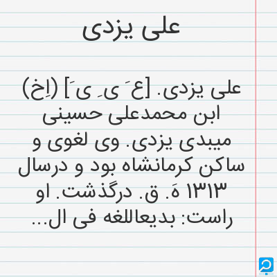 علی یزدی. [ع َ ی ِ ی َ] (اِخ) ابن محمدعلی حسینی میبدی یزدی. وی لغوی و ساکن کرمانشاه بود و درسال 1313 هَ. ق. درگذشت. او راست: بدیعاللغه فی اللغات المولده. (از اعیان الشیعه ٔ عاملی ج 42 ص 24).