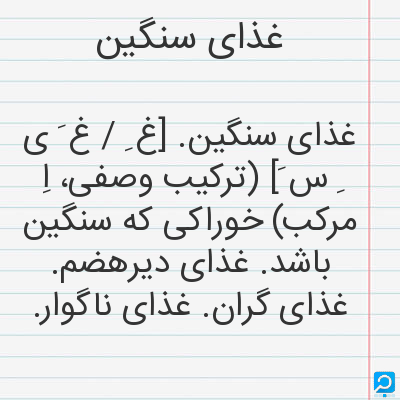 غذای سنگین. [غ ِ / غ َ ی ِ س َ] (ترکیب وصفی، اِ مرکب) خوراکی که سنگین باشد. غذای دیرهضم. غذای گران. غذای ناگوار.