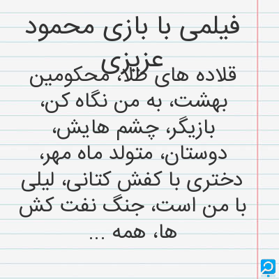 قلاده های طلا، محکومین بهشت، به من نگاه کن، بازیگر، چشم هایش، دوستان، متولد ماه مهر، دختری با کفش کتانی، لیلی با من است، جنگ نفت کش ها، همه یک ملت