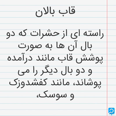 قاب بالان. (اِ مرکب) حشراتی که پر و بال آنها در غلاف باشد مانند سوسکها. (جانورشناسی عمومی ج 1).